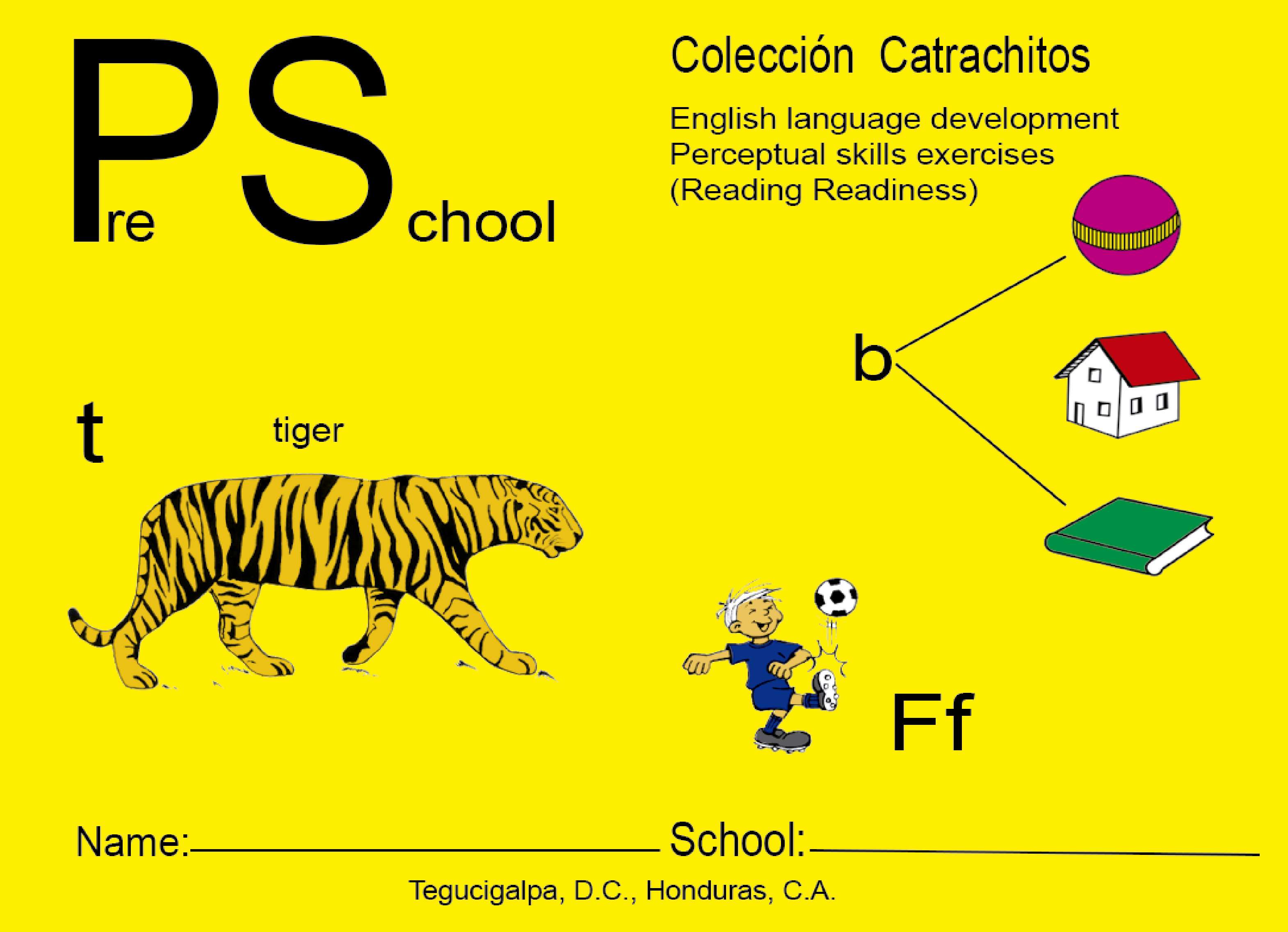 Variados ejercicios para el desarrollo de vocabulario en inglés. Los conceptos que el niño (a) tiene en español son presentados con vocabulario en inglés para ayudarle a comprender lo que será su segundo idioma. Se incluyen los sonidos iniciales de las 26 letras del alfabeto en inglés y los otros sonidos propios de este idioma: sh, ch, ph, wh, sk, st, sq, etc. También continúa desarrollando destrezas propias de preparación para la lectura al discriminar, pintar, agrupar, etc.