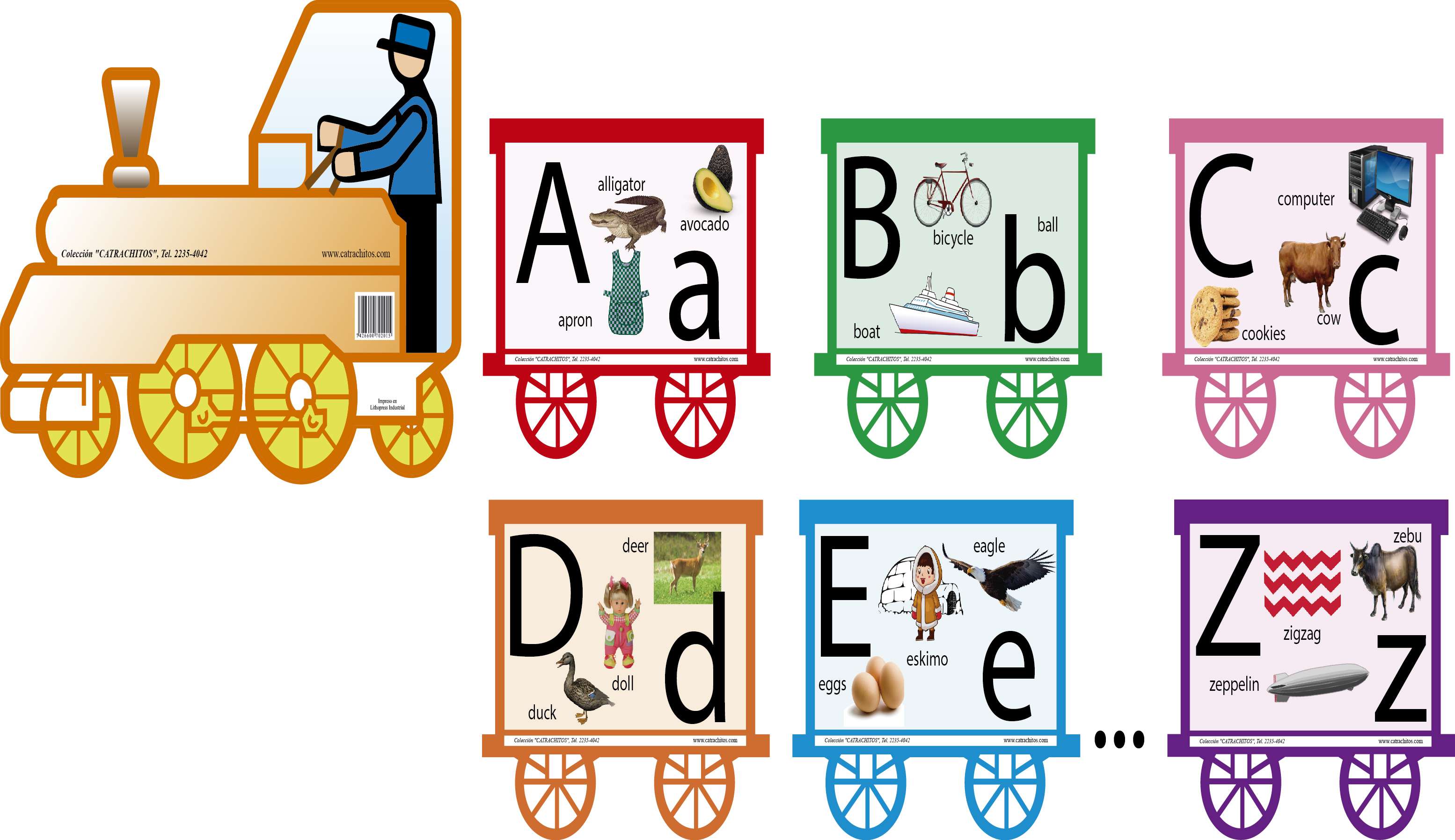 (Alfabeto en Inglés - English Alphabet) Los 26 letras del abecedario, en inglés, (de la A a la Z) ilustrados con carritos que forman el ferrocarril jalado por una máquina. Auxiliar para decorar el aula.