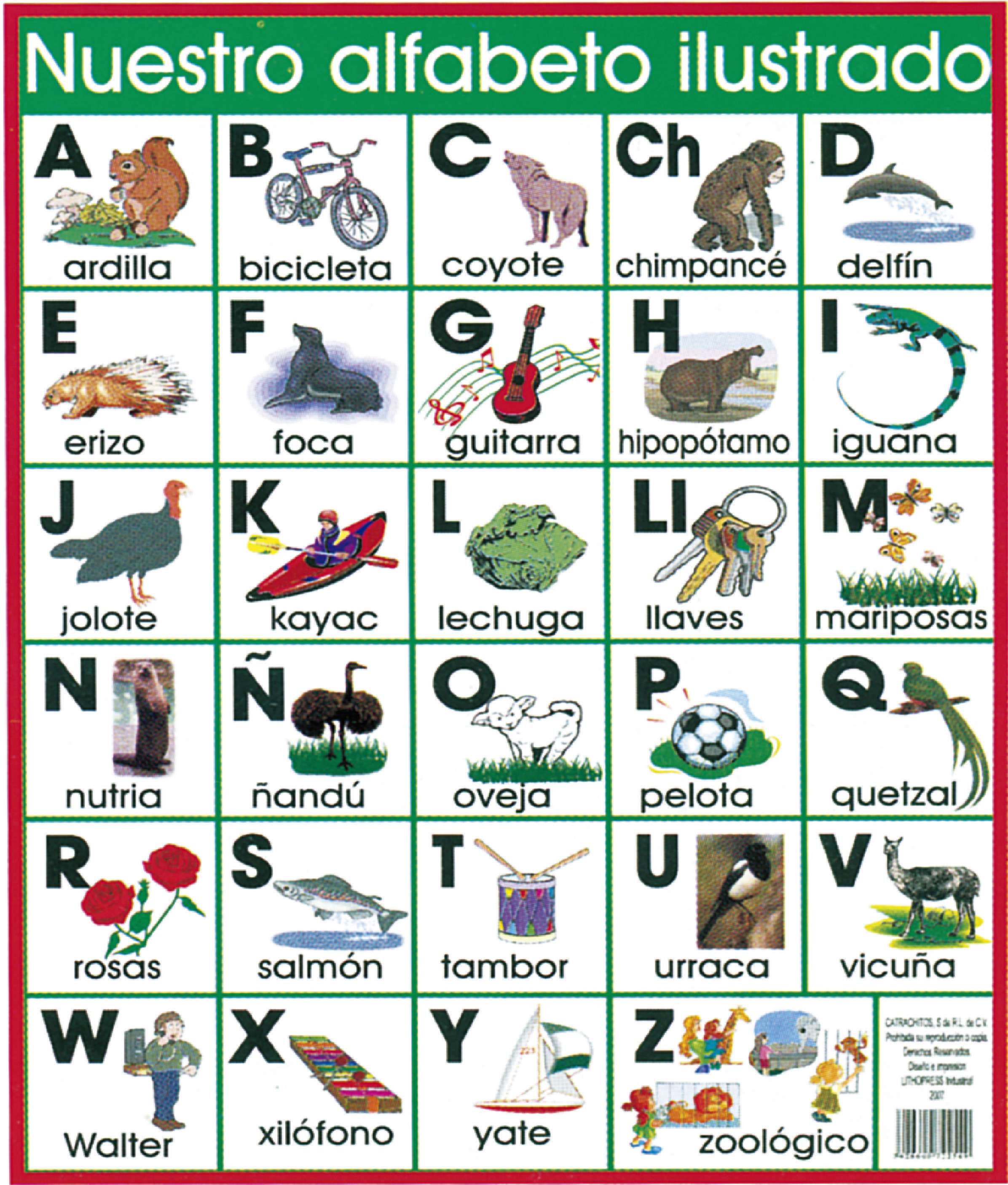 CARTEL ilustrando nuestras 29 letras, con ejemplos de mayúsculas y minúsculas y palabras de la A a la Z.